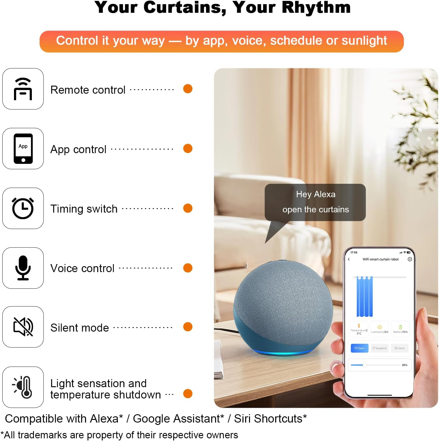 Voice Control, Hands-Free Convenience: Compatible with Alexa, Google Assistant, and Siri Shortcuts, this automatic blind opener and closer lets you control your curtains with a simple voice command—no phone or remote needed. No more bending down, climbing up, or reaching across furniture. Ideal for seniors, pregnant women, people with disabilities, children, and pet-friendly households, this smart curtain opener empowers every family member to control curtains effortlessly with just their voice. Thoughtfully designed to make technology accessible to all, not just the young and tech-savvy