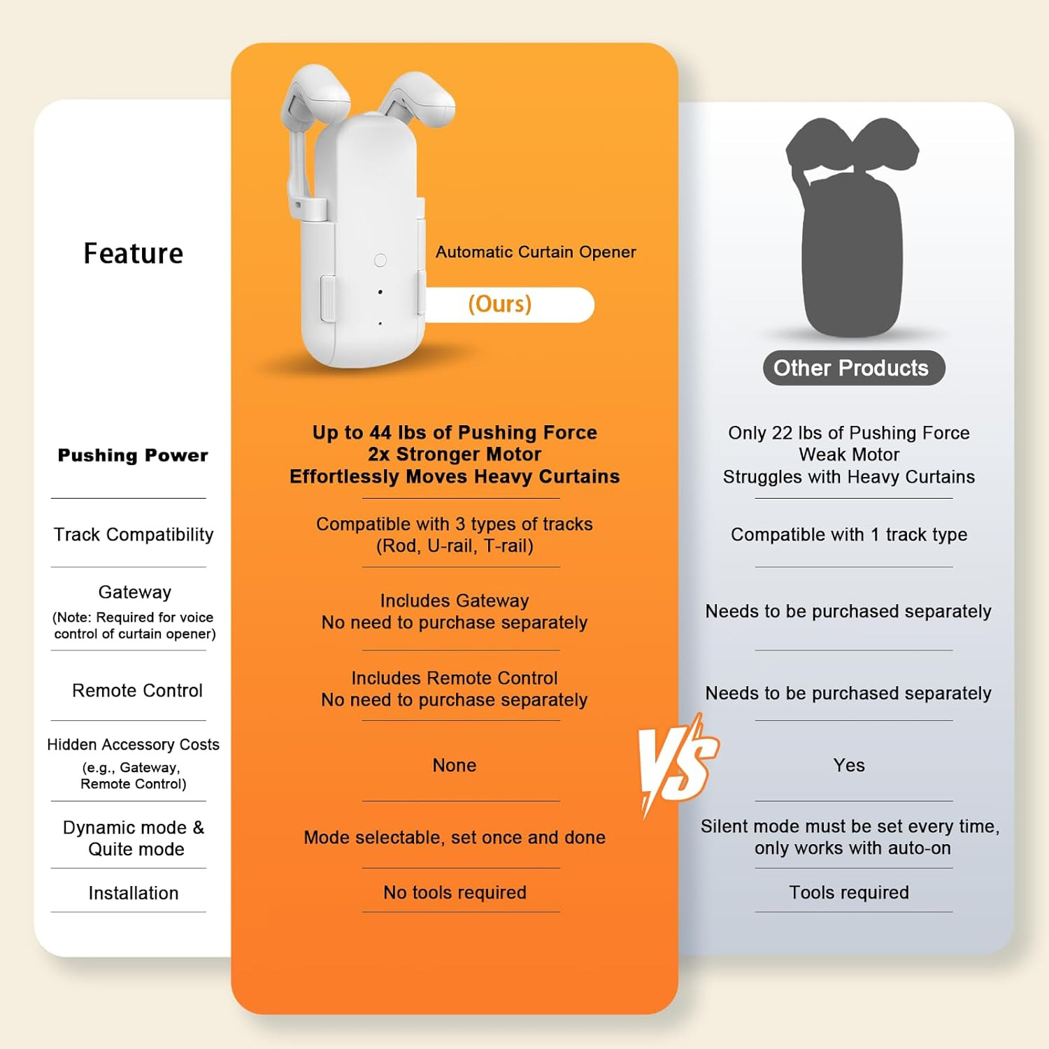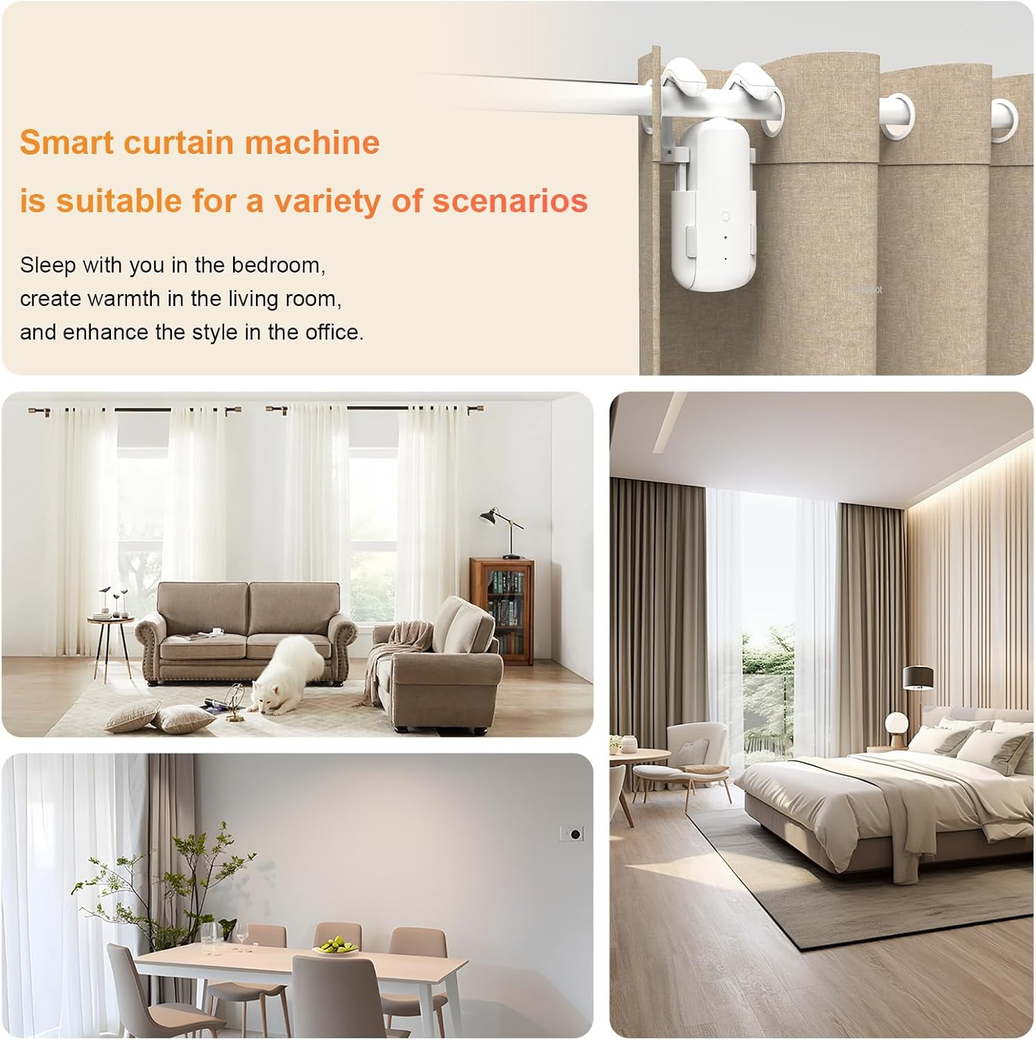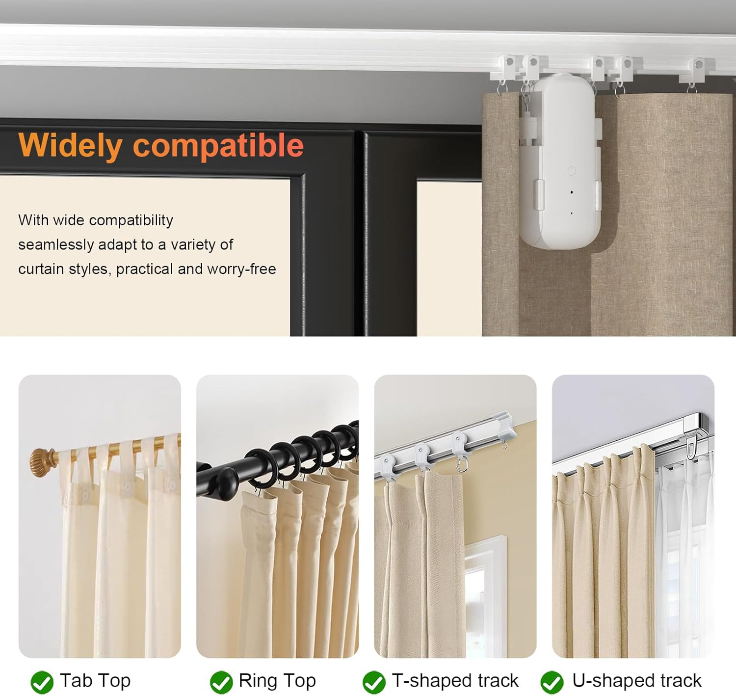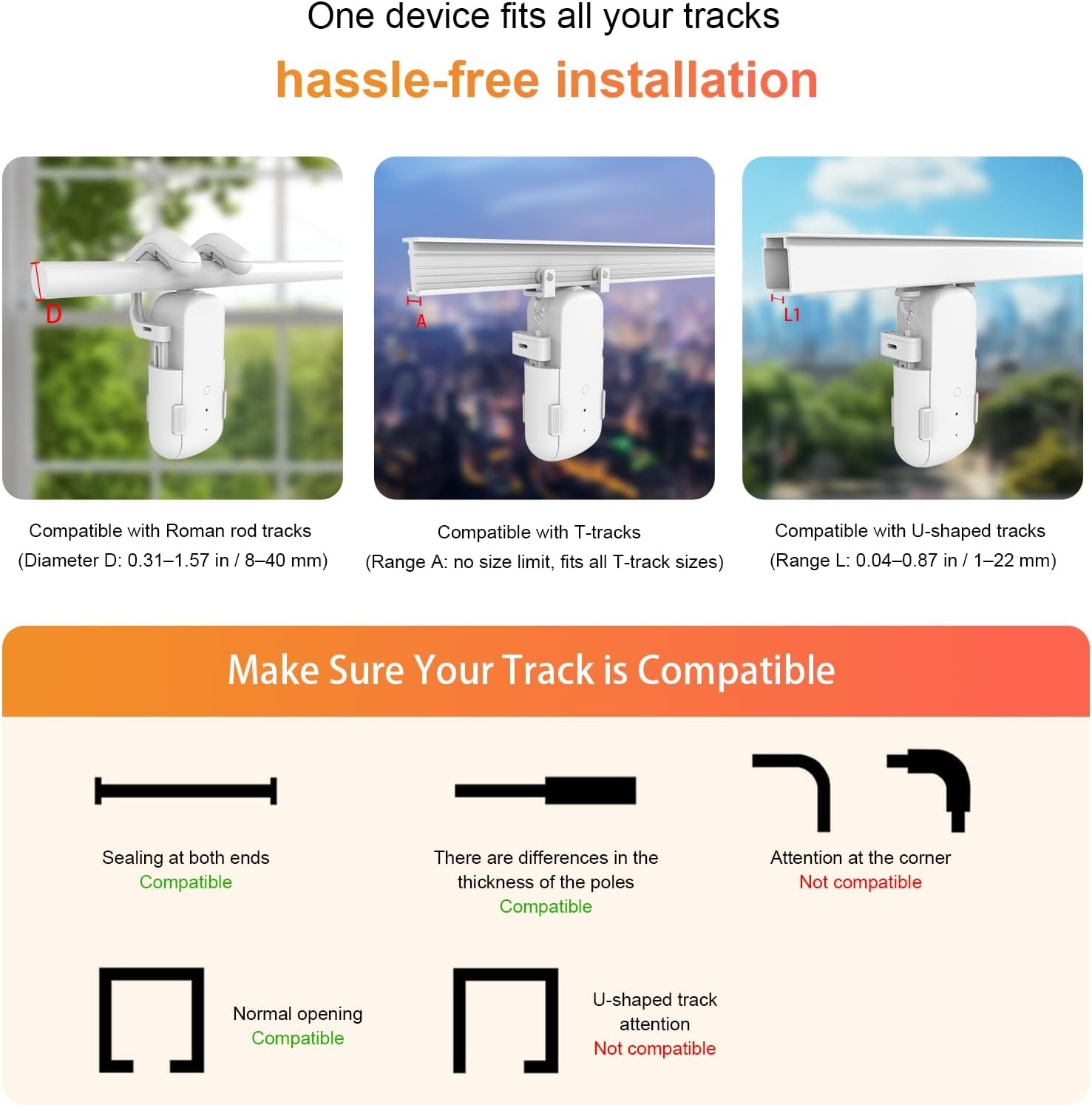 Compatible with 3 Track Types — Upgrade Any Home Easily: This automatic curtain opener supports Roman rods, U-rails, and T-tracks, the three most common curtain systems. It installs directly without replacing your existing setup, preserving your original curtain style while adding smart curtain opener functionality. Whether you live in an older house or modern apartment, nearly any curtain can now enjoy the convenience of automatic curtains with remote. Ideal for villas, bedrooms, duplex stair windows, lake houses, restaurants, or retro homes—this upgrade breathes new life into your space and makes even classic interiors feel cutting-edge